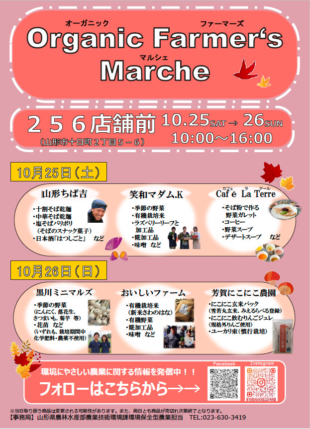 10月25日(土)・26日(日)の2日間、山形市の「256」店舗前で「オーガニックファーマーズマルシェ」が開催されます。実施は今年度2回目だそうです。