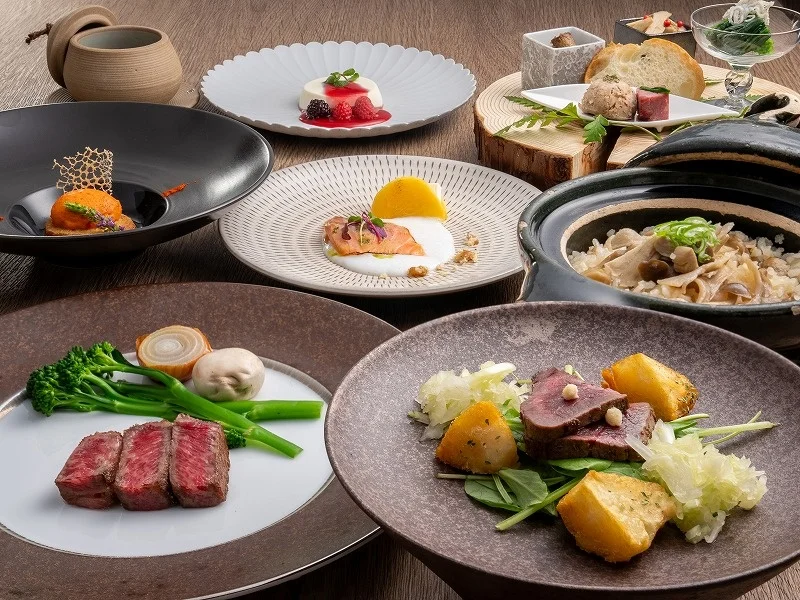 赤根ほうれん草などやまがたの冬野菜をふんだんに使い、メニュー表も絵本のように演出。土鍋ごはんには山形「雪若丸」、メインは山形牛・米沢牛を用意(プランにより)。ワインのペアリングも。