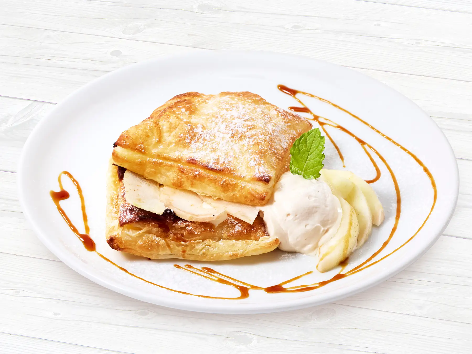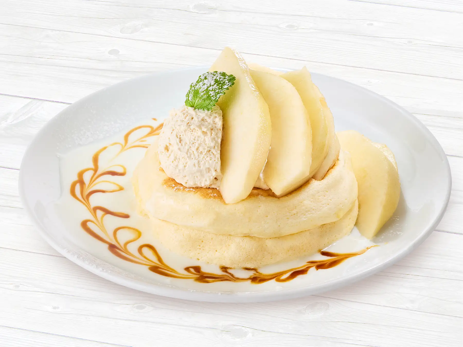 相性抜群のキャラメルクリームヨーグルトソースで、上山産ラ・フランスの香りと甘さを引き立てます。生地は注文後に一枚ずつ丁寧に焼き上げる看板のふわしゅわ食感。“ジャストサイズ”(約ハーフ)も税込1,000円で新登場。
